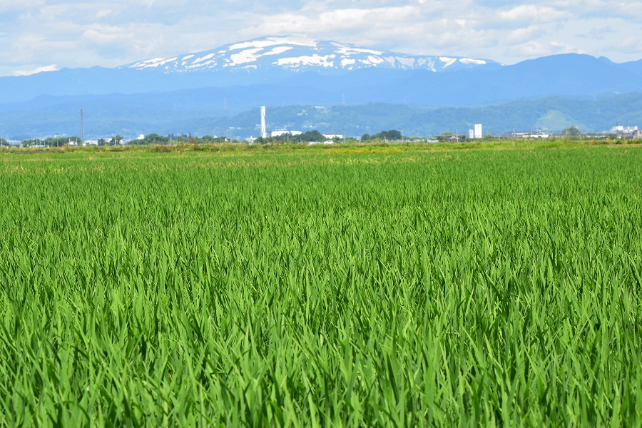 残雪の月山が田んぼの緑に映える(7月1日 天童市寺津にて)