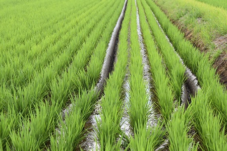 稲の生育は一段と緑が濃くなり、逞しくなってきました。葉の数は9枚目、茎の数は最高に達しています。これから生まれる茎は穂を着けない”無効茎”となります。無効茎の発生を抑え、根の健全な生育を促すために行うのが”作溝・中干し”です。田んぼにたまっている水を落とし、何本かの溝を掘ります。これを”作溝”と呼んでいます(写真上)。田んぼは小ヒビが入るくらいに10日間ほど乾かします。”中干し”です。中干しで、稲体は黄色味を帯びて硬くなり、根は深く伸びます。