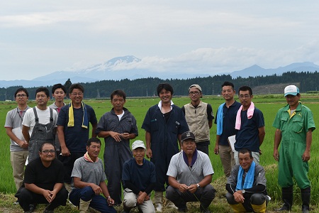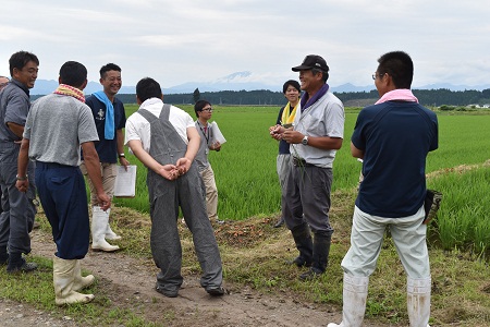 JAもがみ中央の酒米研究会”ゆびきりげんまん”(代表 指村貞芳さん)が10日、恒例になっている青田巡回を行いました。この日、生産者14名、JA,アスクの関係者総勢20名が軽トラを連ね、酒造好適米「出羽燦々」、「美山錦」、「雪女神」の田んぼを見て回り、穂肥(出穂前25~20日の追肥)の適期を診断し合いました。
