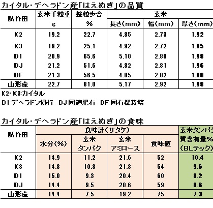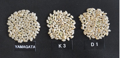 玄米品質:千粒重はK2,K3で19g、D1,DJ,DFで21gで山形産が22.7gなのに比べ2g近く小さかった。整粒歩合は砕米が多かったこと、とくにK2,K3は熱風害のためか乳白粒も多く極端に低かった。デヘラドーンは砕粒が多かった。