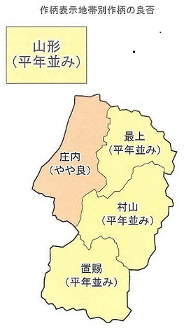 山形県の水稲作柄概況(8月15日現在)について東北農政局は8月31日「平年並み」と発表。これは、①穂数及び1穂当たりのもみ数が6月中旬の低温・日照不足(気象経過図赤⇒)によって一時生育は緩慢となったものの、6月下旬以降は高気温、多照で経過したことから「平年並み」と見込まれる、②全もみ数(穂数×1穂当たりもみ数)は「平年並み」と見込まれるためとしています。