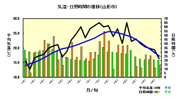 さて、本県の水稲作柄概況(9月15日現在)について東北農政局は予想される10アール当たりの収量は前年より5kg少ない593kgと発表しました。作況指数は県全体が「平年並み」(平年収量比99~101)となっています。前年より減収したのは、全モミ数は「平年並み」となりましたが、8月下旬以降の日照時間が平年を下回って推移(上の気象図)したことで、登熟は「やや不良」の見込まれるためです。