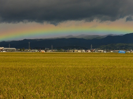 列島を縦断した台風24号は山形県を1日未明に通過、朝方には月山の方向に垂れ込めた黒い雲の下に虹が表れました。