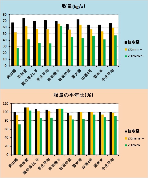 ① 粗収量(無選別)の平年比は早生群(美山錦・羽州誉・龍の落とし子の3品種)106%、中生群(出羽燦々・出羽の里・雪女神・山酒4号・酒未来の5品種)101%で平年を上回る。