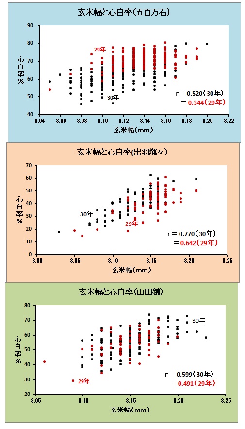 粒形と心白率との関係では3品種とも粒幅との相関が高かった。心白率は整粒中当たり心白粒の割合である。 粒幅と心白率の相関係数は出羽燦々がもっとも高く、r=0.770(30年)、0.642(29年)で、次いで山田錦がr=0.599(30年)、0.491(29年)、そして五百万石でr=0.520(30年)、0.355(29年)であった。長戸らは(心白米に関する研究第1報:日作紀27(1):1958)酒米品種雄町、八反錦を供試し次の知見を得た。