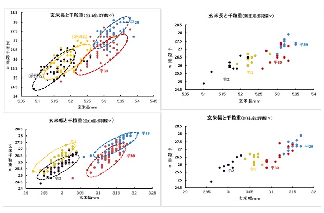 玄米千粒重は精米、タンパク含有量、シンパク発現などの多くの醸造適性との 関連が深い。 品種間でも大粒のものが、同一品種であっても大粒となるほうが 良いとされる。大粒に育て るには、①頴果分化期から穂孕期、とくに出穂前15日 ころの穂孕期間の栄養条件を良好にする、過剰なもみ数を着生させないでもみ殻 を大きくすること、②登熟初期間を多照・気温日較差大など、登熟に有利な気象条 件下で経過させること、で粒長、粒幅が大きく肥大し、千粒重は大きくなることを、 酒米産地のサンプルの調査データもこれまでの知見と同様の結果を示している。