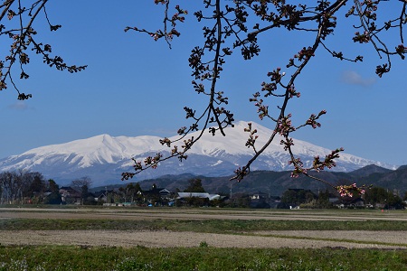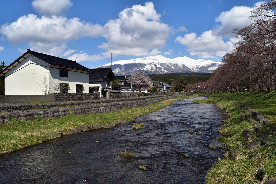 鳥海山と洗沢川の桜並木(4月16日) 庄内遊佐町中山、清冽な洗沢川に沿って建つ昔ながらの石垣の護岸、黑瓦、白壁、黑板の家並に懐かしい原風景を見る思いがします。目を見上げれば雪で真っ白に輝く鳥海山。そして満開の桜(残念ながら咲き始め)、心豊かに過ごした庄内平野の春の一日でした。