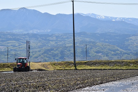代掻きを終えた種子田(後方は月山) 試験田の代掻き(後方は蔵王山 5月8日)