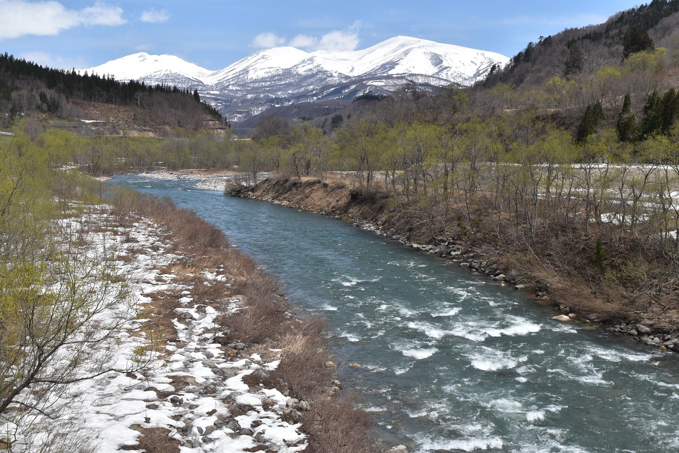 清流寒河江川より月山、湯殿山を望む(西川町大井沢にて5月1日)