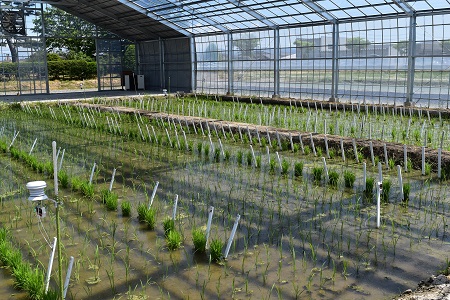 田植えを終えたばかりの試験田には、品種名や育成中の材料(系統、雑種集団など)を記した白いラベルが立ち並び壮観です。毎年作付けされるおびただしい数の雑種個体や系統は、食味、品質、収量性、耐病性、耐冷性、近年では高温耐性の特性について10数年もの間厳しい選抜、淘汰が繰り返され、品種になるのはそれらの頂点に立つほんの一握りとか。爽やかな風にそよぐ苗、この中から新品種が誕生することを期待し試験場を後にしました。
