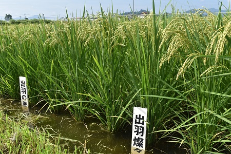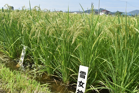 アスク試験田の登熟状況(8月13日) 山形は厳しい残暑が続いています。最高気温は7月23日から8月13日まで30℃以上が連続しています。13日以降も20日まで、30℃以上と予報されています。この暑さでアスク試験田の酒造好適米品種の登熟は一気に進み、黄色くなり始めました。 予報どおり高温が続くと、”白未熟粒”、”胴割れ粒”の発生による品質低下が懸念されます。お盆休み中でも、田んぼまわりと水管理はまめに行いましょう。