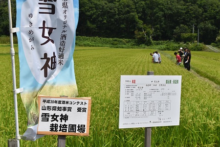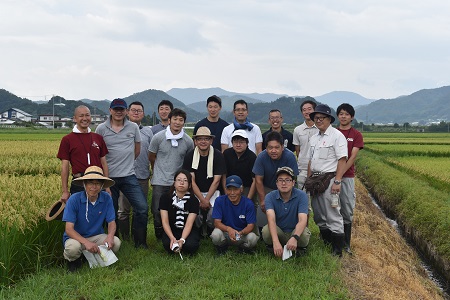 8月24、25日県内蔵元の杜氏さん、県工業技術センター、アスクのメンバーで構成される「山形県研醸会酒米研究班」20名ほどが、置賜地方の酒米生産地の田んぼを巡回しました。杜氏さんたちは穂が黄色味を帯び重く垂れている田んぼに入り生育状況を調査、生産者からも直接話を聞きながら、作柄を確かめていました。