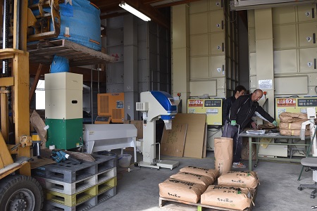 種子調製の施設は、写真からも分かりますように、二人が創意工夫を凝らしたものです。フレコンを持ち上げるフォ-クリフト、もみの芒(のげ)、枝梗(しこう)、ワラくずを取り除く脱芒機、充実したもみのみを選別する回転型選別機、昇降機、秤をつなぎ合わせ効率的に作業を進めます。一品種の作業が終えるごとに丁寧な掃除は欠かせません。作業は4日ほど続きます。原々種子の調製にはタイガーカワシマ社のだつぼー君を新規導入しました。2.2mmのグレイダーで選別した種子はこれまでよりきれいに仕上がり、効率も上がりました。
