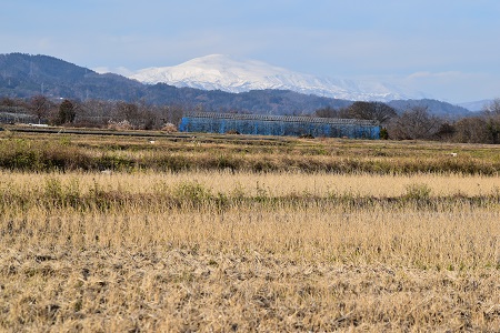 9日、村山・置賜の県内陸地方は冬とは思冬とは思えないほどの青空が広がりました。新雪の山々が眩しいほど輝いています。この晴天は今日だけとのこと。県内の積雪状況は、山間部や北部で多く、12月7日には大蔵村肘折で113㎝(12月7日)、西川町大井沢56cm、尾花沢市80cmでした。平野部での積雪も間もなくでしょう。