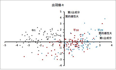 出羽燦々:主成分に対する意味づけや生産年別サンプルの分布は五百万石、山田錦とほぼ同様であった。