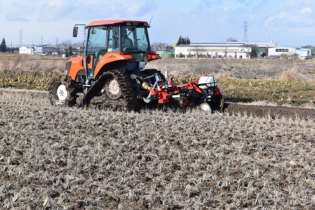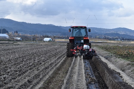 きのう、今日と山形は冬に逆戻りしたかのような天気、”春は名のみの風の寒さや”、早春賦の歌詞を実感します。寒風をついて今年の米づくりがスタートしました。クロ塗です。この指とまれの山口泰弘さん、平吹正直さんのトラクタがエンジン音を響かせています。トラクタに装着したクロ塗機が回転しながら一直線上に土をきれいに塗り付けていきます。