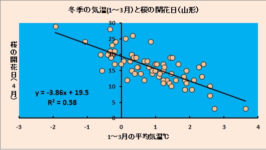 そこで、1953年から2020年までの68年間の冬季間(1~3月)の平均気温と桜の開花日(データはいずれも山形気象台から引用)との関係を調べました。その関係が上図です。図は桜の開花日は1~3月の平均気温と関係が深く、気温が高い年は開花日が早まることがわかります。回帰式から平均気温が-1℃で4月23日、0℃で20日、1℃で16日と予測されます。すなわち、平均気温1℃の差で4日ほど早まったり、遅くなったりします。