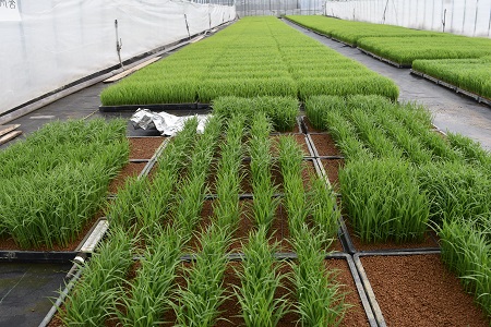 苗生育(手前は原原種、後は原種) 代掻きの水が入る試験田(5月7日) 連休中は好天気に恵まれたこともあり、アスク試験田の苗は順調に育っています。ハウス内に一面に緑のじゅうたんを敷いたように爽やかな光景が広がっています。春耕を終えた田んぼには今日から一斉に水が入り始めました。いよいよ代掻きスタートです。15日にはアスク恒例の社員による田植えが予定されています。