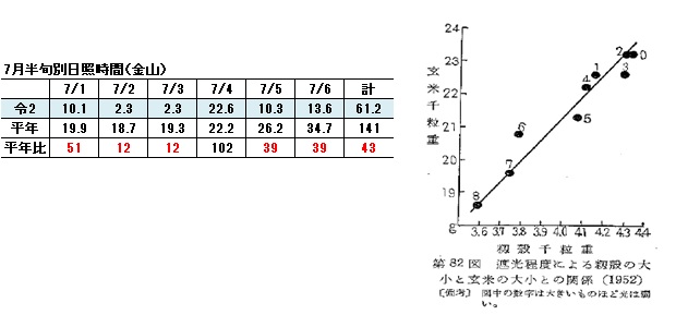 そこで、アスク試験田におけるこれまでの調査データから、酒造好適米品種”出羽燦々”について、7月中旬の日照時間と千粒重との関係を見てみました。両者の関係にはフレはありますが、日照時間の対平年比が50%以下の少照年、80~100%の平年、そして160%の多照年を取り上げると、それらの千粒重は24.8g、25.4g、26.8g(平均値)でした。