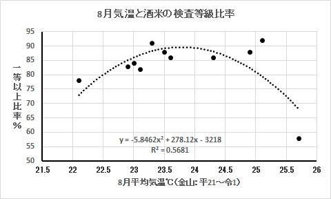 酒米についても調査をしたところ、酒米の作付け面積が県内で最も多い金山町の8月平均気温と県内全体の1等米以上の上位比率との関係も一般米と同様の関係が見られ、24℃以上では上位比率は低下します(注:山形市の気温では26℃以上)。