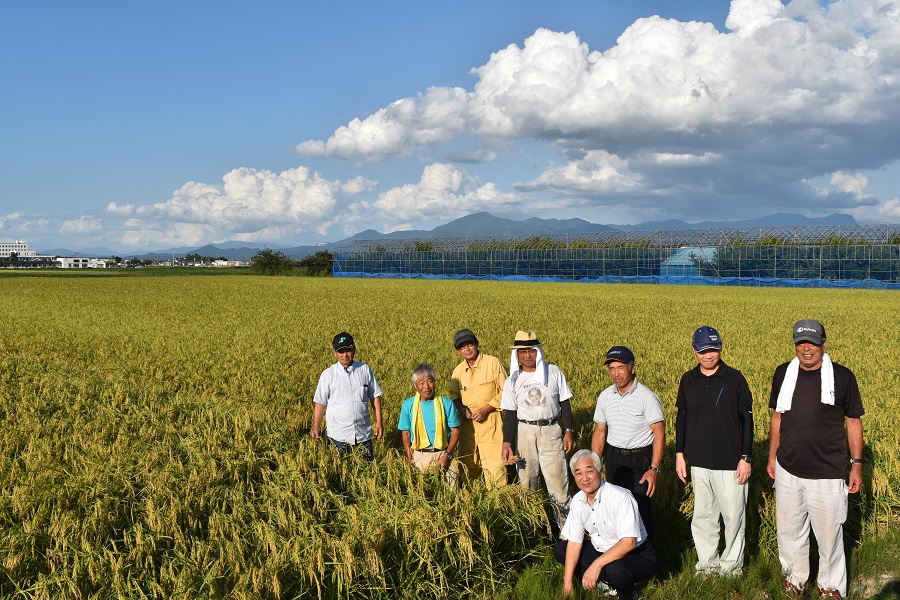 この暑さが少し柔らかくなった午後、酒造好適米品種山酒4号(玉苗)の生産者グループ、かほく酒米研究会(奥山喜男会長)が刈り取り前の圃場巡回をしました。この巡回は毎年行っているもので、メンバーの圃場を観察し、刈り取り時期の診断、出来具合などの情報を交換し合う場です。