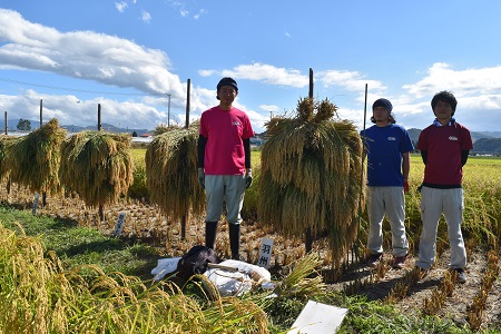 刈り取り、乾燥はすべてが手作業、グループはこれらの作業には不慣れなこともあり、稲杭の立て方、稲束の架け方のコーチを受けながら、大汗を掻きながら無事終了し稲架が並ぶ前で決めポーズ。暑い中ご苦労様でした。