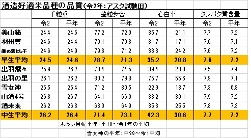 令2年産アスク試験田の酒造好適米品種の品質調査の概要は上表のとおりです。