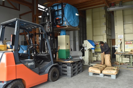 これらの種子生産を一手に担っているのが「この指とまれ」の山口泰弘、平吹正直さん、種子生産を手掛けて16年目になります。二人が工夫した種子調製の施設は、フレコンを持ち上げるフォークリフト、籾の芒(ぼう)、枝梗(しこう)、ワラくずを取り除く脱芒機、充実したもみのみを選別する回転型選別機、昇降機、秤をつなぎ合わせたもので効率的に作業を進めます(写真左)。一品種の作業が終えるごとに丁寧な掃除は欠かせません。作業は4日ほど続きます。原々種子の調製は脱芒機に2.2mmのグレーダーを取り付け、きれいに効率的に精選します(写真右)。