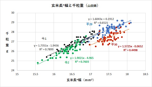 ③回帰式から、単位(L*W)当たり千粒重の増加量は0.9g/0.5mm2で、出羽燦々の1g/mm2と近似した値である。